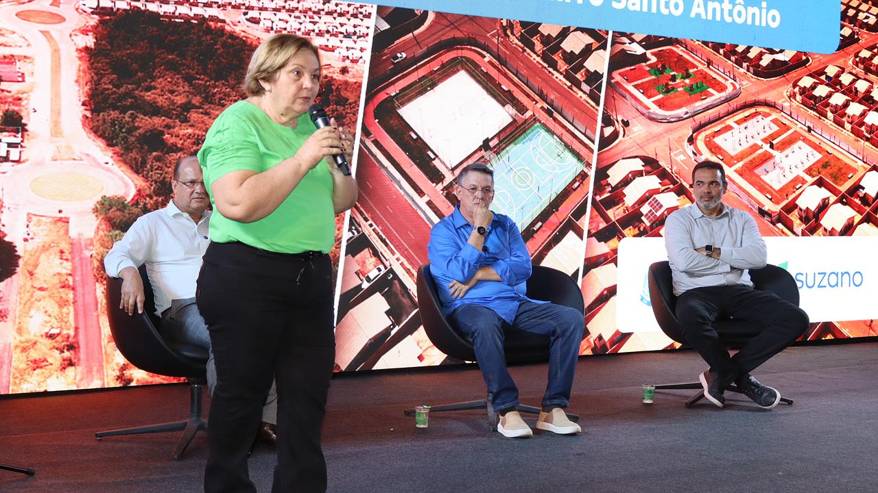 O início do evento se deu com a gerente de Relações Institucionais da Suzano, Marisa Coutinho, apresentando o Programa de Apoio à Gestão Pública – Ribas 100.